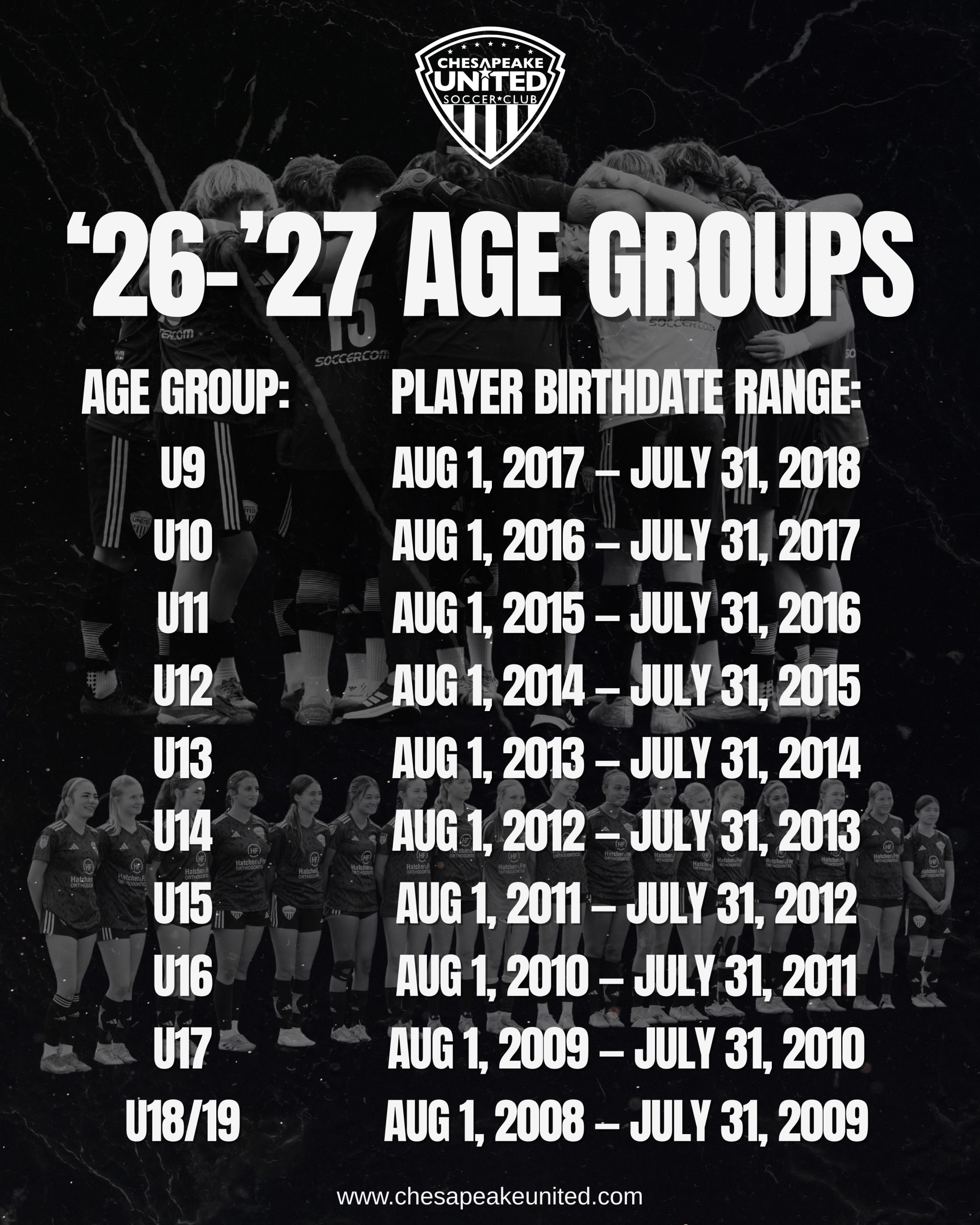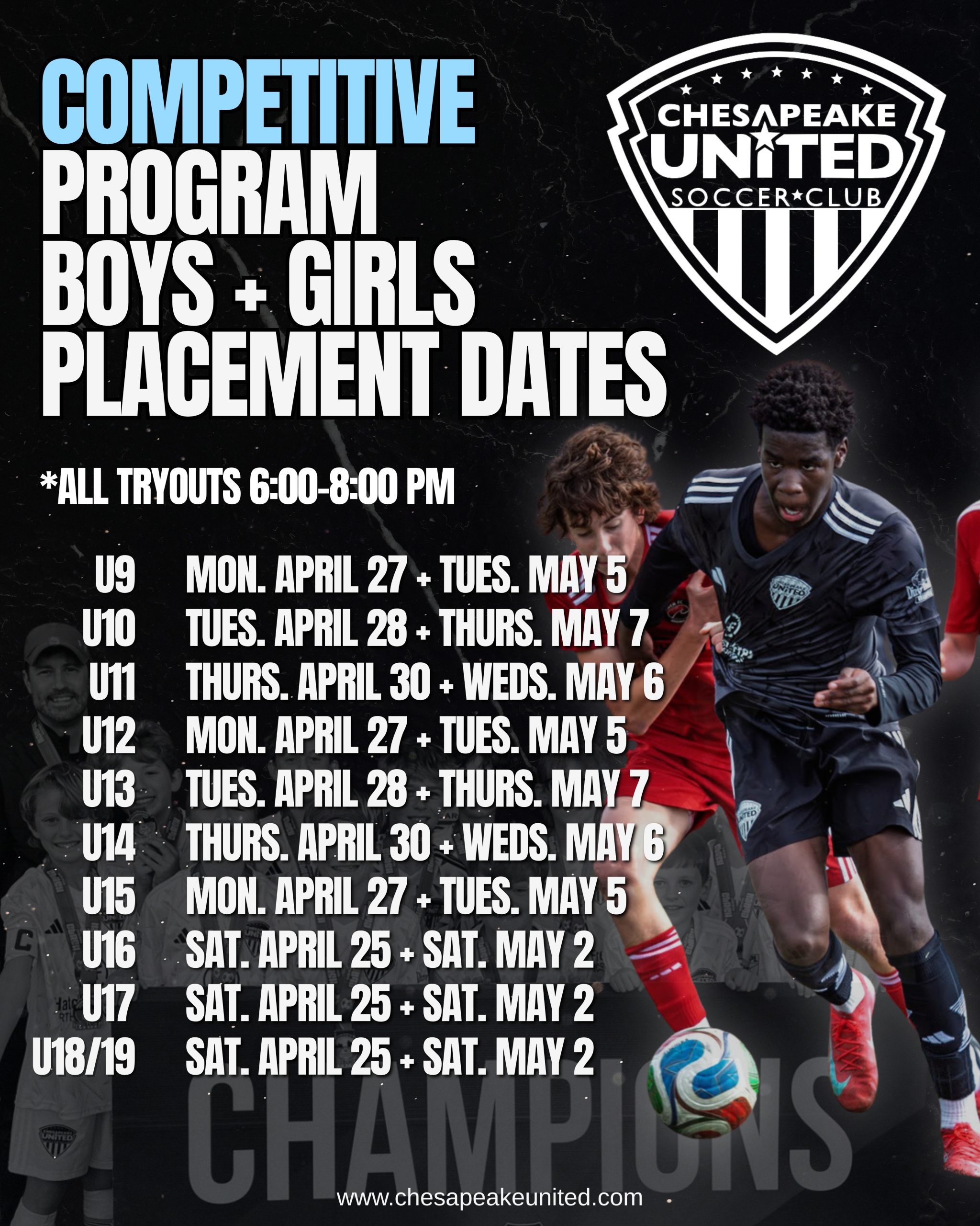 > The placement schedule is posted above. Check dates, times, and age groups to be sure your player attends the appropriate sessions for their respective age, gender, and program. Players who are currently playing up should attend placements with their current team unless directed otherwise. It is strongly suggested that players attend all sessions for their respective age groups. In the event that your player is unable to attend both sessions, please contact Admin@ChesapeakeUnited.com.